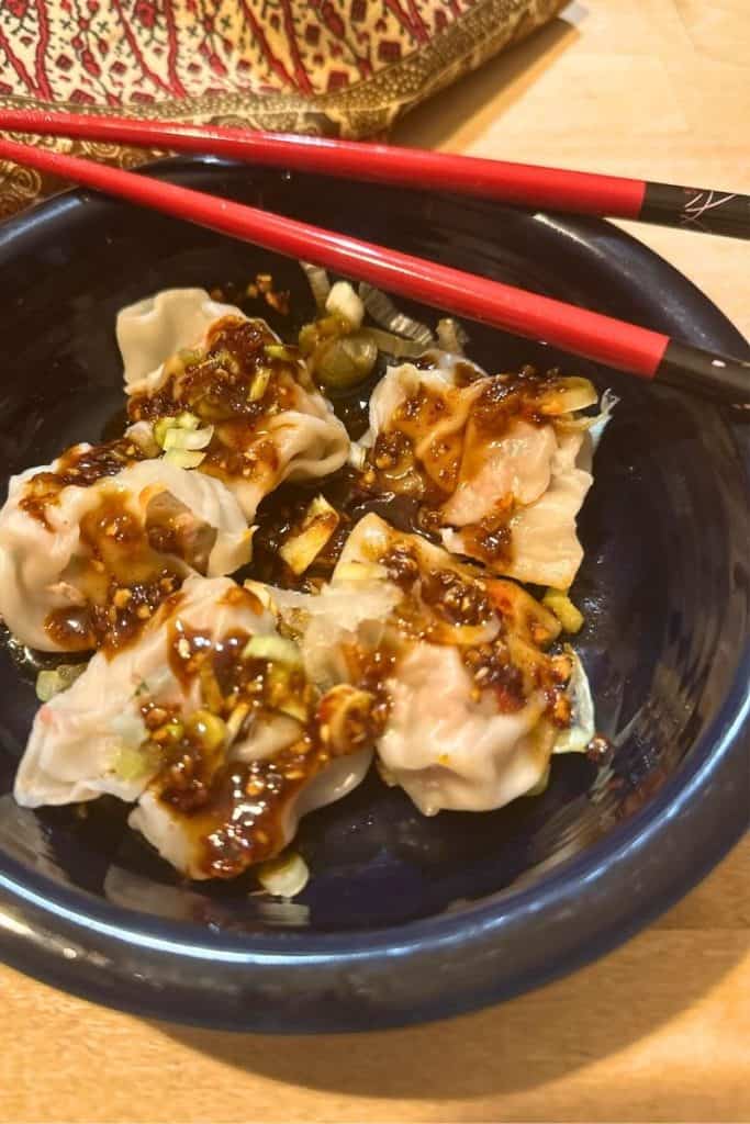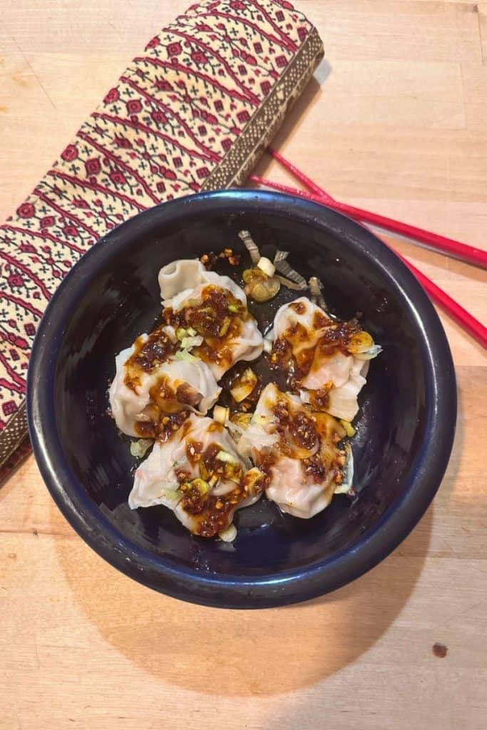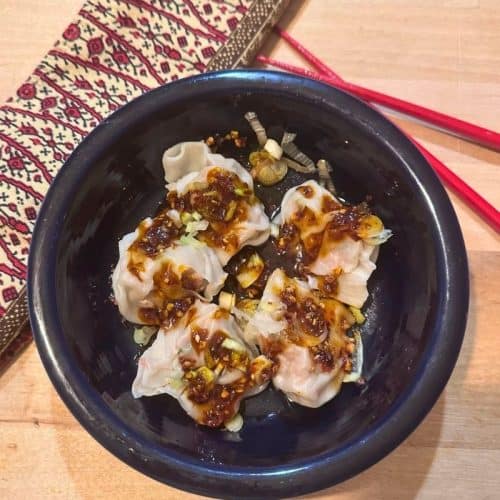 The Chili Oil Sauce is just crispy chili crunch oil, soy sauce, and rice wine vinegar. You can add or subtract heat depending on your preference. I love to put a few of these in a bowl and pour a few tablespoons of sauce on top, sprinkle some scallions, and you will soon be in dumpling heaven.
