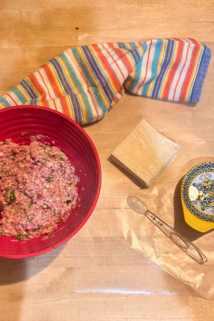 If you do not have ham left over, you can certainly sub in ground turkey, chicken, or even shrimp if you desire. The ratio is basically 3:1 ham to ground pork.