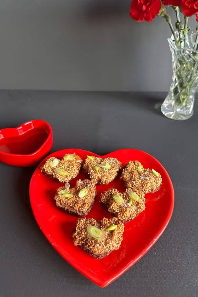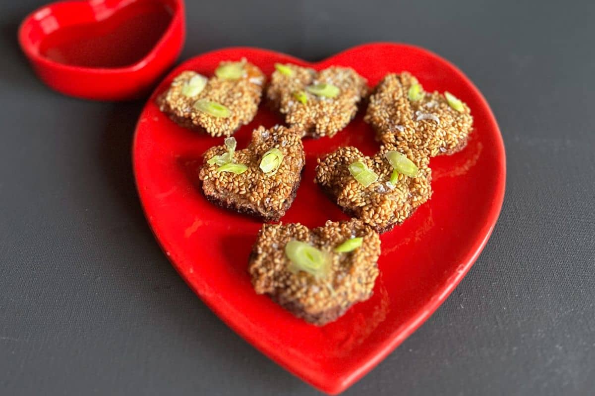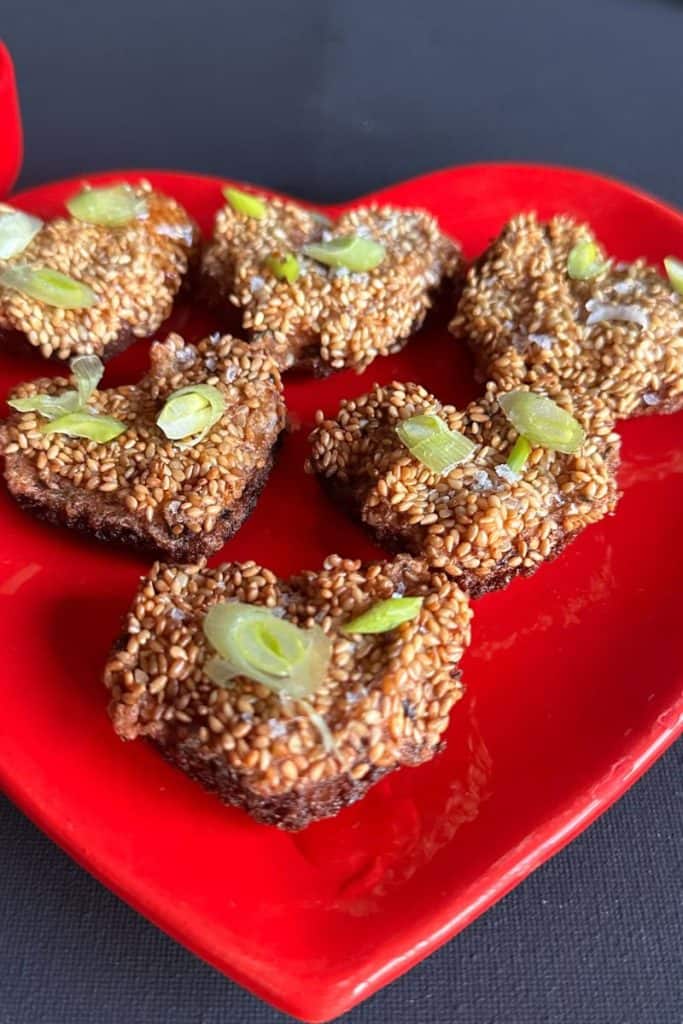 Indulgent and delicious bites of sesame covered shrimp paste cut in heart shapes to serve on Valentines Day or cut into triangles for any day that you want something a bit special