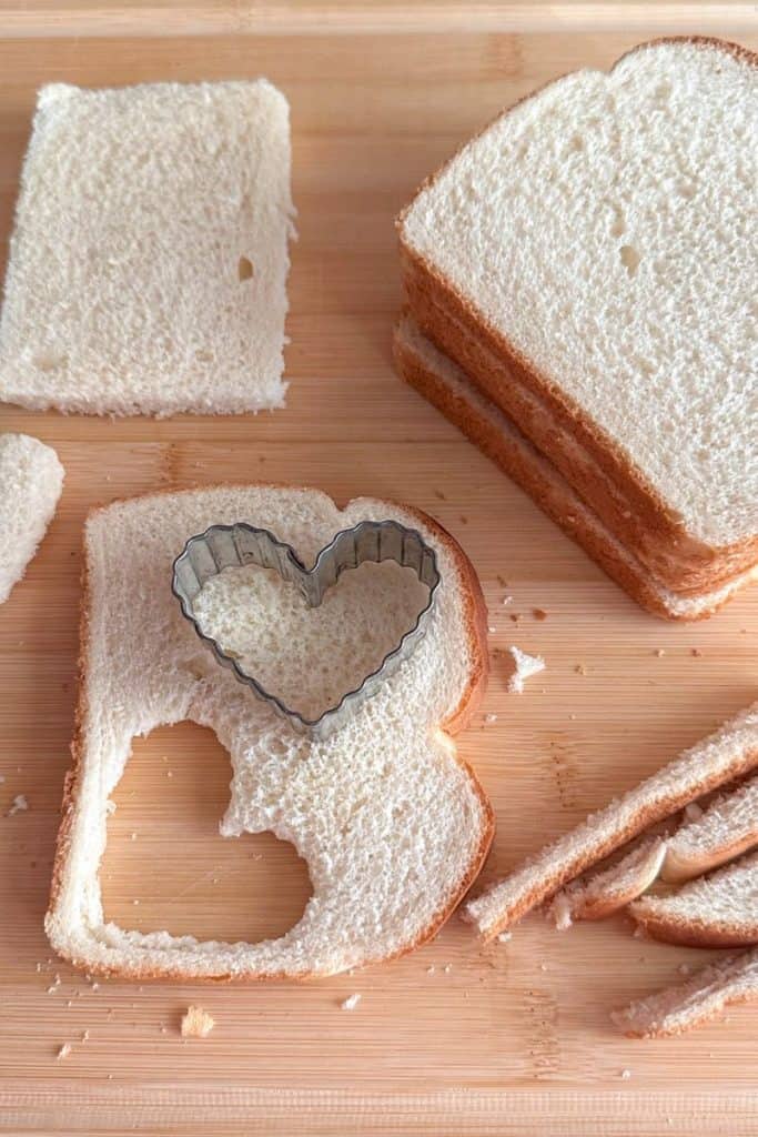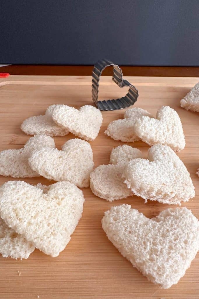 • Using heart shaped cookie cutter cut out 24-30 heart shapes saving the extra bread for bread crumbs in the future