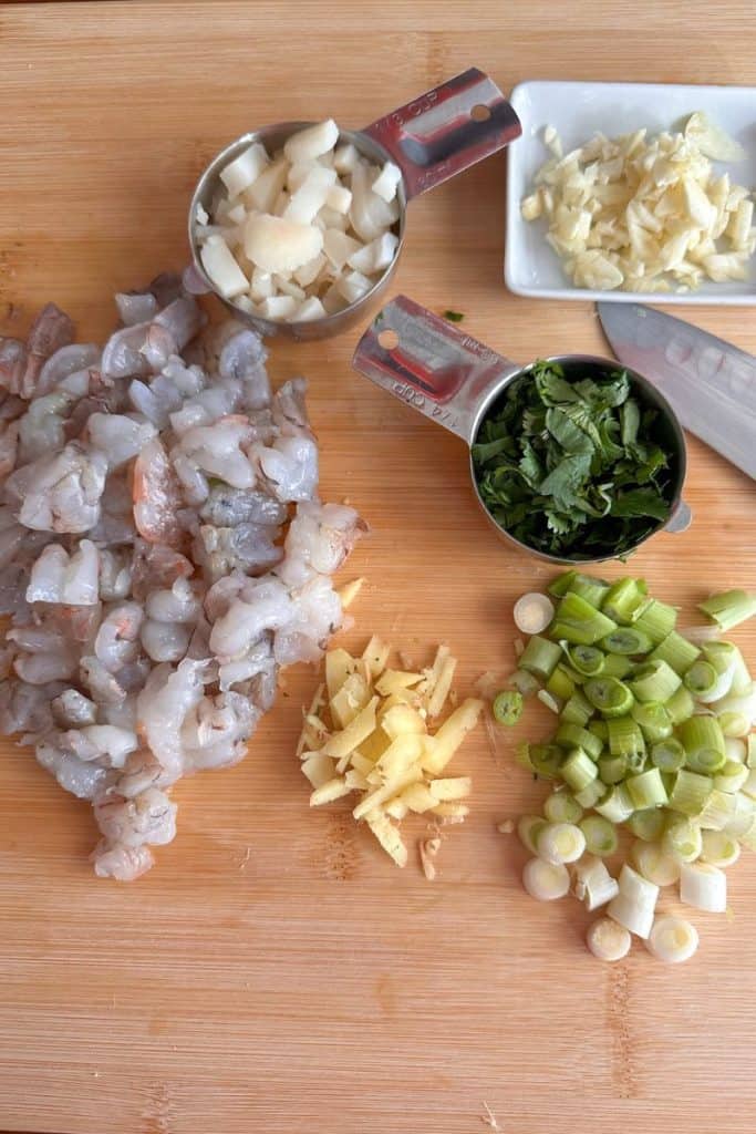 Gather everything you need and chop your shrimp, ginger, scallions, garlic, cilantro, and water chestnuts.