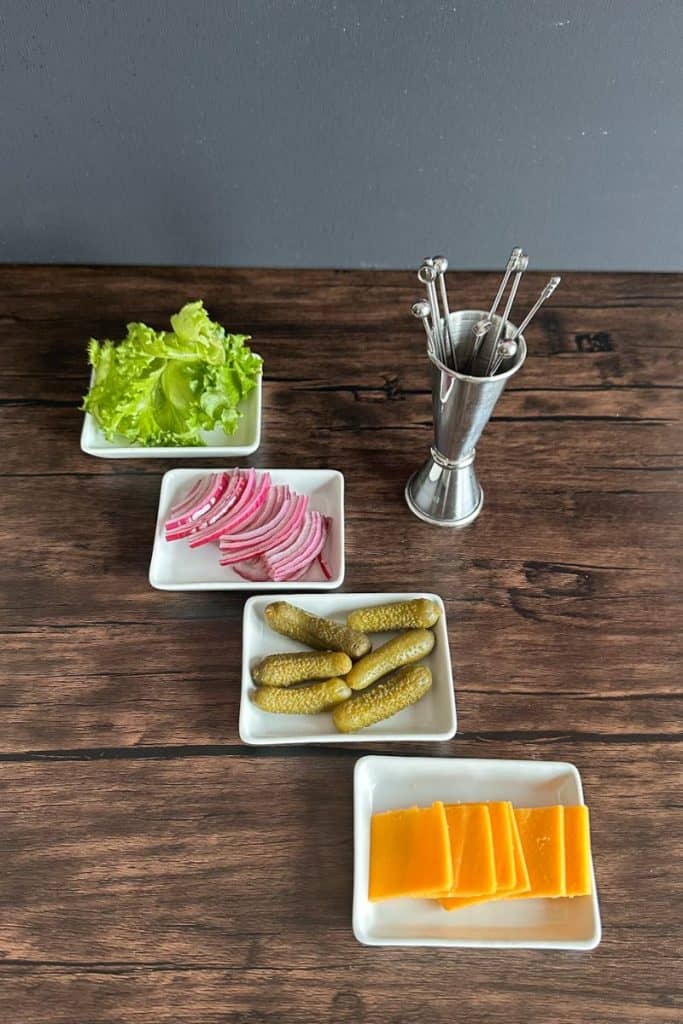- Assemble Cheeseburger Bites by putting little burger on a tater tot then top with onion, lettuce and pickle chip then top with additional tater tot and secure with a toothpick