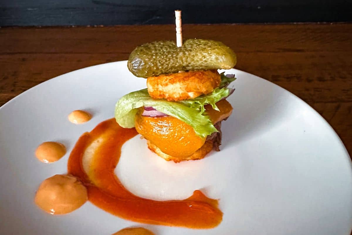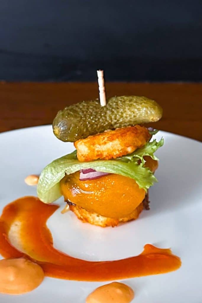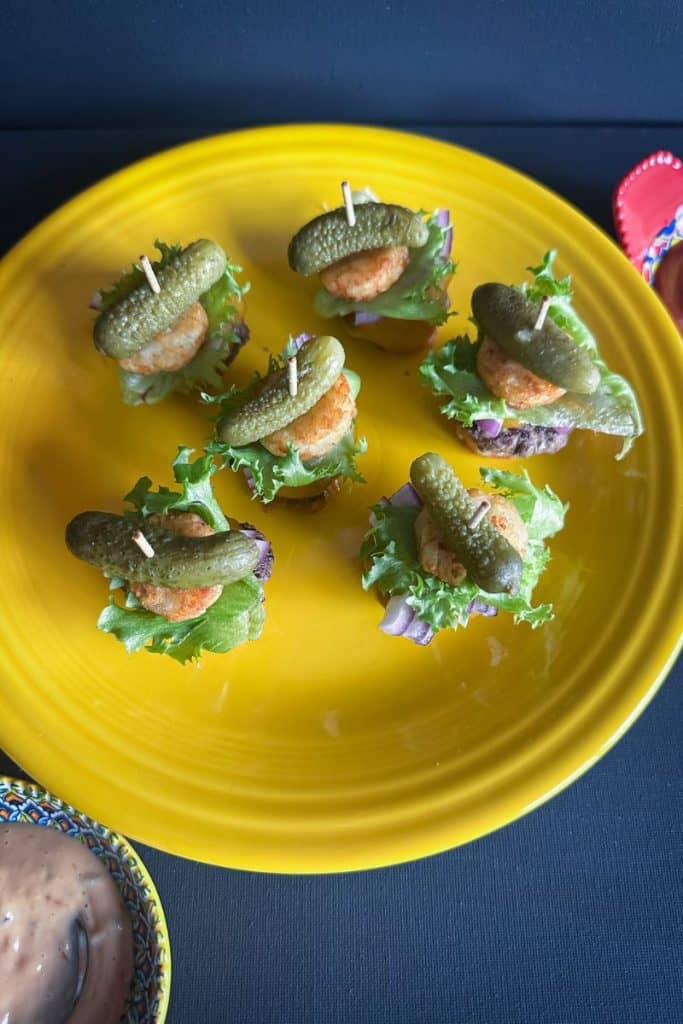 - Assemble the bites:Â Place a mini burger between two tater tot rounds. Add onion, lettuce, and a pickle chip or mini pickle on top. Secure everything with a toothpick.